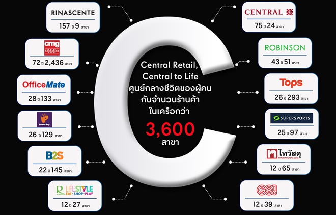 - เซ็นทรัล มาร์เก็ตติ้ง กรุ๊ป 72 ปี : ผู้จัดจำหน่ายสินค้าแฟชั่น และสินค้าความงามอินเตอร์แบรนด์ บริหารแบรนด์สินค้ากว่า 43 แบรนด์ในรูปแบบร้านค้า และเคาน์เตอร์จำหน่ายสินค้า ปัจจุบันมีทั้งหมด 2,436 สาขา