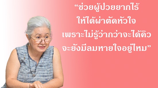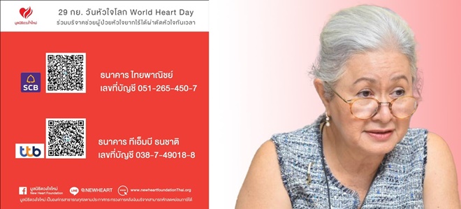 ยังมีอีกหลายชีวิตที่กำลังรอการเดิมพันเพียงลำพัง มาร่วมกันสร้างกุศลต่อชีวิตเพื่อนมนุษย์ หยุดเวลาคร่าชีวิต ด้วยการเป็นผู้ให้ ช่วยผู้ป่วยโรคหัวใจผู้ยากไร้ ได้ผ่าตัวหัวใจทันเวลา และมาร่วมสร้างกุศลด้วยการต่อชีวิตเพื่อนมนุษย์เนื่องในวันหัวใจโลก 29 กันยายน กับมูลนิธิดวงใจใหม่ ได้ที่บัญชีออมทรัพย์ ชื่อบัญชี “มูลนิธิดวงใจใหม่” ธ.ไทยพาณิชย์ จำกัด สาขาโรงพยาบาลราชวิถี บัญชีเลขที่ 051-2-65450-7 หรือโทร. 081 915 3651 เพื่อช่วยผู้ช่วยยากไร้ ให้ได้ผ่าตัดหัวใจ เพราะไม่รู้ว่ากว่าจะได้คิว…จะยังมีลมหายใจอยู่ไหม?