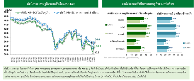 ในเดือนก.พ.65 ภาครัฐมีมาตรการบรรเทาค่าครองชีพของครัวเรือนออกมาต่อเนื่องประกอบกับการเปิดให้ลงทะเบียน Test&Go อีกครั้ง ทำให้เกิดความหวังเกี่ยวกับภาคท่องเที่ยวมากขึ้น ปัจจัยดังกล่าวช่วยหนุนมุมมมองเกี่ยวกับภาวะเศรษฐกิจและการครองชีพของครัวเรือนให้ปรับดีขึ้นจากระดับต่ำสุดเป็นประวัติการณ์ในเดือนก่อน โดยดัชนี KR-ECI ปัจจุบันและ 3 เดือนข้างหน้าอยู่ที่ 33.9 และ 36.0 จาก 30.9 และ 33.2 ในเดือน ม.ค.65 ดัชนีปรับดีขึ้นในทุกองค์ประกอบ