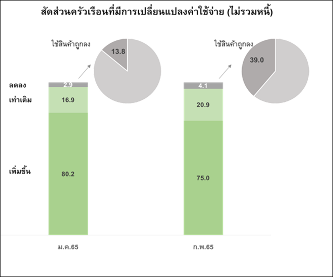 อย่างไรก็ตาม เมื่อพิจารณาในส่วนของพฤติกรรมการใช้จ่ายเทียบกับเดือนก่อนพบว่าครัวเรือนส่วนใหญ่ยังมีค่าใช้จ่ายที่เพิ่มขึ้น ขณะที่ครัวเรือนที่มีค่าใช้จ่ายลดลงกลับมีสัดส่วนเพิ่มขึ้น เนื่องจากปรับเปลี่ยนพฤติกรรมการใช้จ่ายไปใช้สินค้าที่มีราคาถูกลงหรือลดค่าใช้จ่ายลงเพราะกังวลเกี่ยวกับเรื่องเงินทองในอนาคตจึงได้เริ่มลดค่าใช้จ่ายในปัจจุบันลง ดังนั้นแม้ดัชนีปรับดีขึ้นจากมาตรการของภาครัฐ แต่ภาพรวมครัวเรือนยังคงมีความกังวลจากสถานการณ์ราคาสินค้าที่ปรับสูงขึ้นในปัจจุบัน