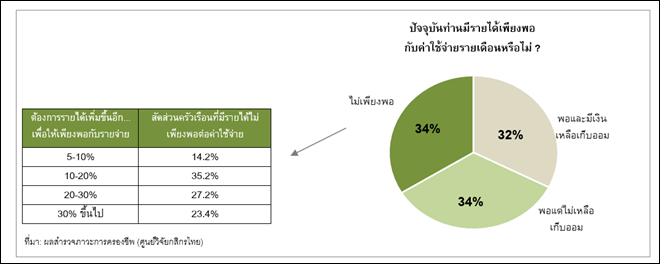 ศูนย์วิจัยกสิกรไทยได้สำรวจเพิ่มเติมเกี่ยวกับประเด็นความสอดคล้องกันระหว่างรายได้และรายจ่ายของครัวเรือน พบว่ามีครัวเรือนจำนวน 33.8% ที่มีรายได้ไม่เพียงพอกับรายจ่ายรายเดือน และในสัดส่วนนี้ครัวเรือนส่วนมาก (35.2%) ต้องการรายได้เพิ่มอีกประมาณ 10-20% เพื่อให้มีรายได้เพียงพอกับรายจ่าย (ยังไม่เหลือเก็บออม) ผลสำรวจดังกล่าวสะท้อนความเปราะบางของครัวเรือนกว่า 70% ของการสำรวจว่าไม่มีเงินเก็บออม (ครัวเรือนที่สำรวจมีรายได้ต่อเดือนส่วนใหญ่กระจุกตัวอยู่ที่ไม่เกิน 30,000 บาท)