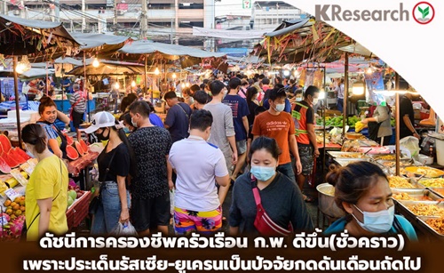 สถานการณ์ความขัดแย้งระหว่างรัสเซียและยูเครนจะเข้ามาเป็นปัจจัยเสี่ยงสำคัญต่อภาวะเศรษฐกิจและการครองชีพ โดยศูนย์วิจัยกสิกรไทยมองว่าครัวเรือนมีแนวโน้มเผชิญกับภาวะราคาสินค้าที่สูงลากยาวจากราคาพลังงานในตลาดโลกที่คาดว่าจะอยู่ในระดับสูงไปจนถึงครึ่งปีหลังนี้ ขณะที่ภาครัฐยังทยอยออกมาตรการมาแบ่งเบาภาระต่าง ๆ ต่อเนื่อง ล่าสุดมีการกล่าวถึงโครงการคนละครึ่งระยะที่ 5 ซึ่งจะมีการประเมินหลังสิ้นสุดระยะที่ 4 (เม.ย.65) นอกจากนี้สถานการณ์โควิด-19 ที่จำนวนผู้ติดเชื้อรายวันเพิ่มสูงขึ้นต่อเนื่องยังเป็นอีกหนึ่งความเสี่ยงที่ต้องจับตามอง แม้จะไม่ได้กระทบรุนแรงต่อกิจกรรมทางเศรษฐกิจแต่อาจเป็นตัวซ้ำเติมสถานการณ์เศรษฐกิจให้มีความเปราะบางมากขึ้น