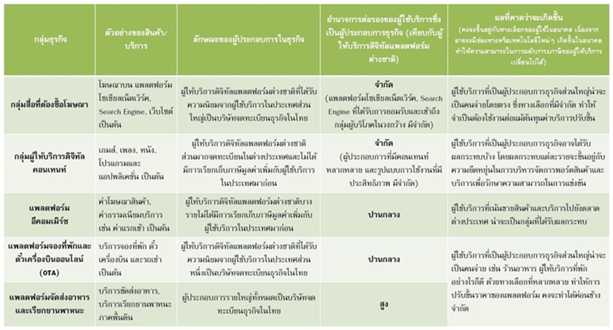 การจัดเก็บภาษีมูลค่าเพิ่มจากผู้ให้บริการดิจิทัลแพลตฟอร์มต่างประเทศ มีเจตนาเพื่อสร้างความเป็นธรรมในการแข่งขันระหว่างผู้ประกอบการของไทยและผู้ประกอบการต่างชาติ แต่ในอีกมุมมองหนึ่งการจัดเก็บภาษีก็จะส่งผลกระทบต่อผู้ที่อยู่ในห่วงโซ่ของธุรกิจในมิติต่างกัน โดยแม้ดูเหมือนว่า ผลที่เกิดขึ้น น่าจะกระทบต่อผู้ใช้บริการมากกว่าผู้ให้บริการดิจิทัลแพลตฟอร์มต่างประเทศ เนื่องจากผู้ให้บริการดิจิทัลแพลตฟอร์มเป็นผู้ให้บริการรายใหญ่ระดับ Global Company และผู้ให้บริการแพลตฟอร์มเหล่านี้จะครองส่วนแบ่งการตลาดที่สูง ทำให้อำนาจต่อรองสูง ขณะเดียวกันผู้ให้บริการบางรายยังเผชิญกับความท้าทายในการสร้างผลกำไร อีกทั้งธุรกิจการแข่งขันด้านเทคโนโลยีที่สูง ทำให้ผู้ให้บริการต้องลงทุนและพัฒนารายผลิตภัณฑ์ใหม่ๆ เพื่อสร้างรายได้ การแบกรับต้นทุนจึงเป็นเรื่องที่ยาก ดังนั้น จึงเป็นไปได้ที่ผู้ให้บริการดิจิทัลแพลตฟอร์มอาจจะมีการส่งผ่านต้นทุนมายังผู้ใช้บริการ
