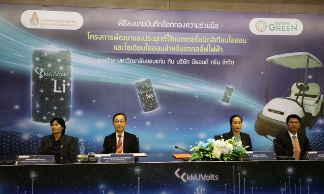 รองศาสตราจารย์ นพ. ชาญชัย พานทองวิริยะกุล อธิการบดีมหาวิทยาลัยขอนแก่น และ คุณศุภัสสร เชาว์วิศิษฐ์ กรรมการบริษัท บียอนด์ กรีน จำกัด ร่วมลงนามบันทึกข้อตกลงความร่วมมือ ใน  “โครงการผลิตและประยุกต์ใช้แบตเตอรี่ชนิดลิเทียมไอออนและโซเดียมไอออนสำหรับรถกอล์ฟไฟฟ้า” โดยบูรณาการความร่วมมือเพื่อนำผลิตภัณฑ์แบตเตอรี่ชนิดลิเทียมไอออนของโรงงานแบตเตอรี่และพลังงานยุคใหม่ภายใต้แบรนด์ kkUVolts รวมถึง พัฒนาเทคโนโลยี นวัตกรรม และการประยุกต์ใช้แบตเตอรี่ชนิดโซเดียมไอออน ขยายไปยังธุรกิจรถกอล์ฟไฟฟ้าและรถไฟฟ้าอเนกประสงค์ครบวงจรในภูมิภาคเอเชีย ทั้งนี้มีผู้บริหารทั้งสองฝ่ายร่วมงาน  ณ ห้องประชุมสารสิน ชั้น 2 อาคารสิริคุณากร มหาวิทยาลัยขอนแก่น
