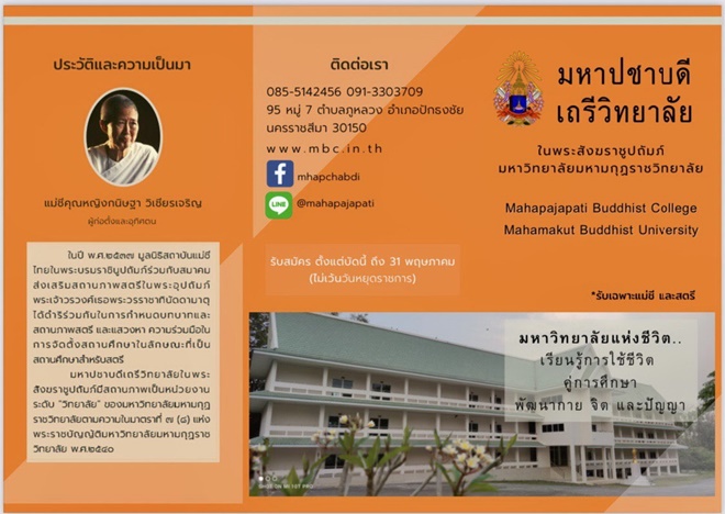 สุภาพสตรีและแม่ชี* ท่านใดที่สนใจสมัครเข้าเป็นนักศึกษาใหม่ในมหาวิทยาลัยแห่งชีวิต สามารถอ่านประกาศการรับสมัครและคุณสมบัติผู้สมัคร พร้อมสมัครเข้าศึกษากับมหาปชาบดีเถรีวิทยาลัย ในพระสังฆราชูปถัมภ์ ได้ที่ www.mbc.in.th หรือ FB: mhapchabdi / LINE: @mahapajapati / โทรศัพท์ 085-5142456, 091-3303709 ตั้งแต่วันนี้ ถึง 31 พฤษภาคม 2565 (ไม่เว้นวันหยุดราชการ)