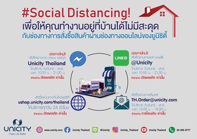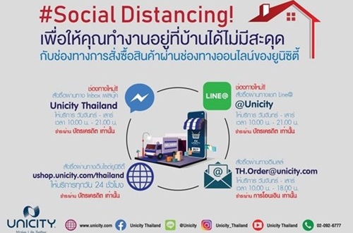 บริษัท ยูนิซิตี้ มาร์เก็ตติ้ง (ไทยแลนด์) จำกัด สร้างแพลตฟอร์มการขายตอบ Customer journey ยุคดิจิทัลไลฟ์สไตล์ เสริมช่องทางขายสำนักงานใหญ่ (Head office) และยูนิซิตี้ DSC 27 สาขาในเมืองหลักๆ ทั่วประเทศ ด้วยการสร้างแพลตฟอร์มการขายทางออนไลน์แบบครบวงจรเพิ่มเป็นทางเลือกใหม่ ทั้ง Unicity App, Facebook, Line@, E-mail และ Website รับสังคมไทยยุค ‘Social distancing’ เพิ่มความสะดวกตอบโจทย์ความต้องการนักธุรกิจยูนิซิตี้แบบครบวงจร เสริมช่องทางขายแบบออฟไลน์ในช่วงสถานการณ์การแพร่ระบาดของเชื้อ COVID-19 และเพื่อเสริมสร้างภูมิคุ้มกันแก่สังคมไทย ยูนิซิตี้ จึงได้พัฒนานวัตกรรมผลิตภัณฑ์ที่มีสารอาหารสร้างภูมิคุ้มกันมารวมไว้ให้ได้เลือกตามความต้องการ เพราะในแต่ละวันมีโอกาสเสี่ยงที่จะสัมผัสกับเชื้อโรคได้โดยไม่รู้ตัว หากช่วงใดร่างกายอ่อนแอก็จะส่งผลไปที่ระบบภูมิคุ้มกันเป็นเหตุให้เกิดอาการป่วยได้