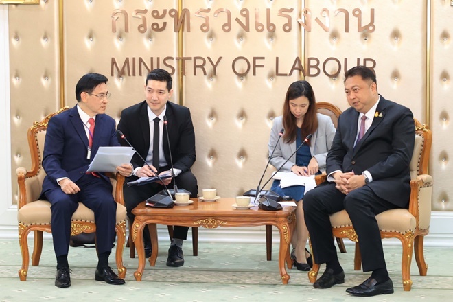 นายสุชาติ ชมกลิ่น รัฐมนตรีว่าการกระทรวงแรงงาน ให้การต้อนรับ คุณอัลกิ้น – เช้ง ไหว่ ก๊อง ประธานสภาองค์การนายจ้างฮ่องกง นายจาตุรนต์ ไชยะคำ กงสุลใหญ่ ณ เมืองฮ่องกง และคณะ ในโอกาสเดินทางเยือนประเทศไทย เพื่อเยี่ยมคารวะรัฐมนตรีว่าการกระทรวงแรงงานและหารือแนวทางการขยายตลาดแรงงานทักษะไทยไปทำงานฮ่องกงป้อนภาคธุรกิจที่มีแผนการขยายตัวเพิ่มขึ้น ตลอดจนเยี่ยมชมการฝึกอบรมของกรมพัฒนาฝีมือแรงงาน โดยมี ผู้บริหารระดับสูงกระทรวงแรงงาน เข้าร่วมหารือในครั้งนี้ด้วย ณ ห้องจัตุมงคล ชั้น 6 อาคารกระทรวงแรงงาน และวิทยาลัยการแรงงาน กรมพัฒนาฝีมือแรงงาน