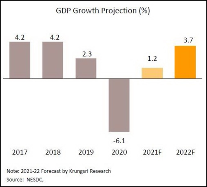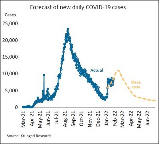 วิจัยกรุงศรีประเมินเศรษฐกิจไทยยังอยู่ในเส้นทางการฟื้นตัว แม้พัฒนาการดังกล่าวอาจล่าช้าออกไปเมื่อต้องเผชิญกับการระบาดของไวรัสโอมิครอน แต่ผลกระทบอาจอยู่ในวงจำกัด เนื่องจากอัตราการเสียชีวิตที่ต่ำ จึงคาดว่าการใช้มาตรการควบคุมจะเข้มงวดน้อยกว่าการระบาดที่เกิดจากไวรัสเดลตาในรอบก่อน โดยในกรณีฐาน คาดว่าจำนวนผู้ติดเชื้อรายวันจะแตะจุดสูงสุดในกลางเดือนกุมภาพันธ์ก่อนจะลดลงอย่างช้าๆ ภาคท่องเที่ยวจะได้รับผลกระทบมากสุดจากการจำกัดการเดินทางระหว่างประเทศ และผลต่อภาพรวมของกิจกรรมทางเศรษฐกิจลดลงราว 0.6% อย่างไรก็ตาม ผลบวกจากมาตรการกระตุ้นเศรษฐกิจล่าสุดซึ่งจะช่วยให้มีเม็ดเงินหมุนเวียนเข้าสู่ระบบเศรษฐกิจได้เป็นอย่างต่ำกว่า 1 แสนล้านบาท กอปรกับความคืบหน้าในการฉีดวัคซีนสนับสนุนให้ทางการทยอยผ่อนคลายมาตรการควบคุมเพิ่มเติม การนำมาตรการ Test&Go กลับมาใช้สำหรับเปิดรับนักท่องเที่ยวต่างชาติ และแรงหนุนจากการขยายตัวของภาคส่งออก ผลกระทบสุทธิจากการระบาดรอบนี้จะทำให้อัตราการขยายตัวของ GDP ยังคงใกล้เคียงกับคาดการณ์เดิม