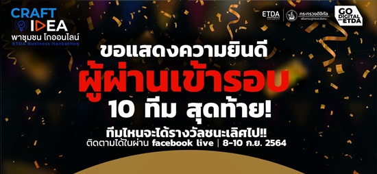 ทั้งนี้ ตั้งแต่เริ่มดำเนินกิจกรรม “CRAFT IDEA พาชุมชน โกออนไลน์” ในรอบคัดเลือกเพื่อเฟ้นหา 10 ทีมสุดท้ายเข้าสู่รอบชิงชนะเลิศ ที่เปิดรับสมัครผลงานแผนธุรกิจอีคอมเมิร์ซชุมชน ตั้งแต่วันที่ 20 มิถุนายน-20 สิงหาคม 2564 ตลอดระยะเวลา 2 เดือนที่ผ่านมา มีทีมสนใจเข้าร่วมสมัครแข่งขันกับ ETDA มากกว่า 200 ทีม รวมกว่า 800 คน ซึ่งคณะกรรมการผู้ทรงคุณวุฒิของโครงการทั้งจาก ETDA และภายนอกได้เร่งพิจารณา คัดเลือกผลงานที่ทุกทีมส่งกันเข้ามาอย่างเข้มข้น เรียกได้ว่า ดูกันอย่างละเอียดรอบครอบทุกชิ้นงานจนวินาทีสุดท้าย และในที่สุดเราก็ได้ 10 ทีมที่ผ่านเข้ารอบที่จะมาแสดงฝีมือกันต่อในเวทีรอบชิงชนะเลิศ Business Hackathon ซึ่งจะจัดขึ้นระหว่างวันที่ 8-10 กันยายน 2564 นี้ โดยทีมที่ผ่านเข้ารอบทั้งหมด ได้แก่ 1. ทีม Winner Winner 2. ทีมผีเสื้อ 4 ตัวจากมหาวิทยาลัยเทคโนโลยีราชมงคลอีสาน 3 .ทีมแอสเตอร์ 4. ทีมวาโนะคุนิ จากสถาบันเทคโนโลยีพระจอมเกล้าเจ้าคุณทหารลาดกระบัง 5. ทีมชิบะคุง จากมหาวิทยาลัยเชียงใหม่ 6. ทีม 4 Husman Marketing จากมหาวิทยาลัยทักษิณ 7. ทีมชายสี่บะหมี่โหน่ง จากมหาวิทยาลัยเกษตรศาสตร์ 8. ทีม OMENTITES จากมหาวิทยาลัยมหิดล 9. ทีม WAIROONIE จากจุฬาลงกรณ์มหาวิทยาลัย และ10. ทีม Energen จากจุฬาลงกรณ์มหาวิทยาลัยและมหาวิทยาลัยธรรมศาสตร์
