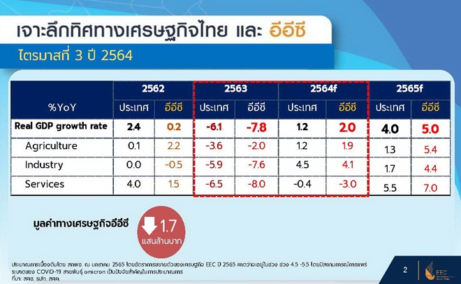เปิดศักราชใหม่ ปี 2565 อีอีซี เร่งสร้างเศรษฐกิจไทยให้เข้มแข็ง ขับเคลื่อนแผนลงทุนระยะ 2 อีอีซี (ปี 2565-2569) ตั้งเป้าเกิดการลงทุน 2.2 ล้านล้านบาท จากการต่อยอดโครงสร้างพื้นฐาน 2 แสนล้านบาท ดึงดูดการลงทุนต่างชาติในอุตสาหกรรมเป้าหมายใหม่ต่อยอดจากฐานปกติ และเศรษฐกิจสีเขียว (BCG) ปีละ 4 แสนล้านบาท เพื่อให้เกิดการลงทุนนวัตกรรมใหม่เคียงคู่สิ่งแวดล้อม รวมทั้งยกระดับคุณภาพชีวิตชุมชนอย่างต่อเนื่อง ซึ่งจะช่วยให้เศรษฐกิจประเทศเติบโตขึ้น (GDP) 5% ต่อปี มูลค่าการส่งออกสินค้าและบริการของไทยมีมูลค่าสูงขึ้นต่อเนื่อง นอกจากนี้ จะเกิดการพลิกโฉมการศึกษาพัฒนาทักษะบุคลากรโดยเฉพาะด้านดิจิทัล ที่จะสร้างตำแหน่งงานใหม่ รายได้มั่นคง