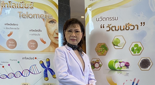 รศ. ดร.ปรียา ลีฬหกุล ผู้เชี่ยวชาญเทโลเมียร์ ที่ปรึกษางานวิจัย APCO ให้ข้อมูล “เทโลเมียร์” คือส่วนที่หุ้มส่วนปลายของโครโมโซม ป้องกันไม่ให้รหัสพันธุกรรมบนโครโมโซมเสียหายและป้องกันไม่ให้ไปเชื่อมเข้ากับโครโมโซมข้างเคียง เกิดเป็นโครโมโซมผิดปกติ ความยาวของเทโลเมียร์สั้นลงตามอายุที่เพิ่มมากขึ้น นอกจากนี้ยังพบว่า การสั้นลงของเทโลเมียร์มีความสัมพันธ์กับโรคไม่ติดต่อเรื้อรังหลายโรคโดยสภาวะความเครียดจากปฏิกิริยาออกซิเดชั่นเป็นปัจจัยเสี่ยงสำคัญที่เร่งอัตราการสั้นลงของเทโลเมียร์ ทั้งนี้การเสริมฤทธิ์ของสารสกัดจากพืชไทย 5 ชนิด “วัฒนชีวา” สามารถช่วยให้ร่างกายชะลอการสั้นลงหรือเสริมสร้างความยาวของเทโลเมียร์เพิ่มขึ้นซึ่งทำให้ทุกอวัยวะได้รับการซ่อมแซมส่วนที่สึกหรอได้รวดเร็วขึ้น กลับมาทำงานได้ดีมากขึ้น ร่างกายจะมีสุขภาพที่ดี ชะลอวัย ย้อนวัย ลดอัตราเสี่ยงต่อการติดเชื้อและการเกิดเนื้อร้าย