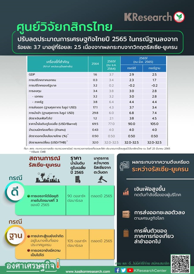 นางสาวณัฐพร ตรีรัตน์ศิริกุล รองกรรมการผู้จัดการ บริษัท ศูนย์วิจัยกสิกรไทย จำกัด มองว่าภายใต้สถานการณ์ดังกล่าว ศูนย์วิจัยกสิกรไทยประเมินผลกระทบแบ่งออกเป็นสองกรณี คือ กรณีฐาน ที่การปะทะสู้รบระหว่างรัสเซีย-ยูเครน จำกัดอยู่ในบางพื้นที่ของประเทศยูเครน แต่ข้อตกลงร่วมกันคงยังไม่เกิดขึ้นในปีนี้ และมาตรการคว่ำบาตรทางเศรษฐกิจของชาติตะวันตกและสหรัฐฯ ต่อรัสเซียจะคงอยู่ไปตลอดทั้งปีนี้นั้น คาดว่าจะทำให้ราคาน้ำมันดิบดูไบมีค่าเฉลี่ยทั้งปีที่ 105 ดอลลาร์ฯ ต่อบาร์เรล และจีดีพีขยายตัวที่ร้อยละ 2.5 ส่วนในกรณีดีนั้น คาดการณ์ตัวเลขจีดีพีไว้ที่ร้อยละ 2.9 ซึ่งเกิดขึ้นบนสมมติฐานที่รัสเซีย-ยูเครนหาทางออกร่วมกันได้เร็วกว่าที่กำหนด หรือภายในไตรมาสที่ 3 ของปีนี้ อันทำให้ราคาน้ำมันดิบอาจย่อตัวลงในช่วงครึ่งปีหลัง และทำให้ค่าเฉลี่ยน้ำมันทั้งปี 2565 อยู่ที่ 90 ดอลลาร์ฯ
