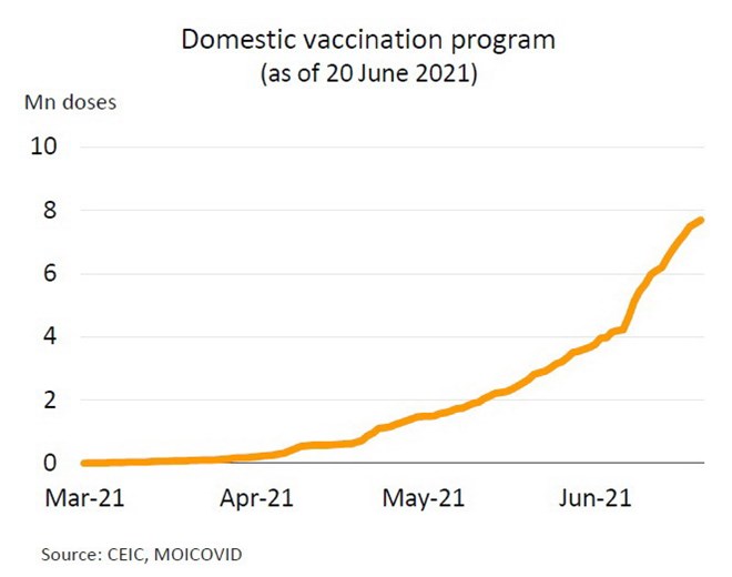 นอกเหนือจากมาตรการของ BOJ แล้ว รัฐบาลญี่ปุ่นยังมีแผนช่วยเหลือครัวเรือนที่ได้รับผลกระทบในวงเงินสูงสุด 1 แสนเยนเป็นเวลา 3 เดือนตั้งแต่เดือนกรกฎาคมนี้ ทั้งนี้สถานการณ์แพร่ระบาดได้เริ่มคลี่คลาย โดยจำนวนผู้ติดเชื้อรายใหม่ต่อวันลดสู่ระดับ 1,554 ราย ขณะที่รัฐบาลผ่อนคลายมาตรการเข้มงวดในพื้นที่กรุงโตเกียวและอีก 6 จังหวัดสู่ภาวะกึ่งฉุกเฉินตั้งแต่วันที่ 20 มิถุนายนถึง 11 กรกฎาคม คาดว่าในครึ่งปีหลังเศรษฐกิจจะปรับตัวดีขึ้นจากแรงหนุนของมาตรการข้างต้น รวมทั้งปัจจัยบวกจาก (i) การขยายตัวของการส่งออกตามการฟื้นตัวของเศรษฐกิจโลก โดยในเดือนพฤษภาคมเติบโตติดต่อกันเป็นเดือนที่ 3 และ (ii) ความคืบหน้าในการเร่งฉีดวัคซีน ล่าสุดมีผู้ได้รับวัคซีนอย่างน้อย 1 โดสคิดเป็น 15.9% ของประชากร และอาจจะบรรลุเป้าหมายสร้างภูมิคุ้มกันหมู่ภายในเดือนพฤศจิกายนนี้