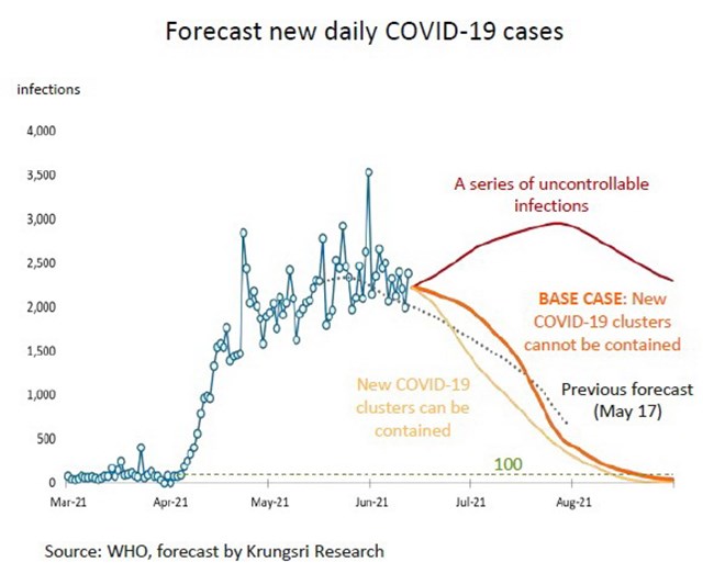 จากแบบจำลองสถานการณ์การระบาด COVID-19 ที่ประเมินโดยวิจัยกรุงศรี (ข้อมูลจำนวนผู้ติดเชื้อถึง ณ วันที่ 12 มิถุนายน) พบว่าในกรณีฐาน การระบาดในกลุ่มคลัสเตอร์ใหม่ยังไม่สามารถควบคุมได้ (เส้นสีส้ม) จำนวนผู้ติดเชื้อรายวันจะยังคงสูงกว่า 2,000 รายจนถึงสิ้นเดือนมิถุนายน อย่างไรก็ตาม จากแผนการปูพรมฉีดวัคซีนทั่วประเทศที่เริ่มขึ้นตั้งแต่วันที่ 7 มิถุนายน หากมีการฉีดวัคซีนอยู่ที่ 250,000-270,000 โดสต่อวัน (เทียบกับค่าเฉลี่ยปัจจุบันที่ 247,212 รายต่อวัน ในช่วงระหว่างวันที่ 7-20 มิถุนายน) จะทำให้ประเทศไทยสามารถฉีดวัคซีนได้ทั้งสิ้น 55 ล้านโดสภายในสิ้นปีนี้ ภายใต้แผนการฉีดวัคซีนดังกล่าว วิจัยกรุงศรีประเมินว่าจำนวนผู้ติดเชื้อรายวันอาจทยอยลดลงหลังเดือนกรกฎาคม และมีแนวโน้มลดลงมาอยู่ในระดับต่ำกว่า 100 รายต่อวันได้ในราวกลางเดือนสิงหาคม (จากเดิมคาดปลายเดือนสิงหาคม) การฉีดวัคซีนที่เร่งขึ้นกว่าหลายเดือนก่อน ช่วยลดความเสี่ยงด้านขาลงต่อเศรษฐกิจ แต่วิจัยกรุงศรียังคงคาดการณ์ GDP ปีนี้เติบโตที่ 2% เนื่องจากหลายปัจจัยยังมีความไม่แน่นอน โดยเฉพาะสถานการณ์การระบาดทั่วโลก ความเพียงพอและการกระจายวัคซีน รวมทั้งความคืบหน้าในการฉีดวัคซีนที่อาจไม่เป็นไปตามแผนที่คาดการณ์ไว้