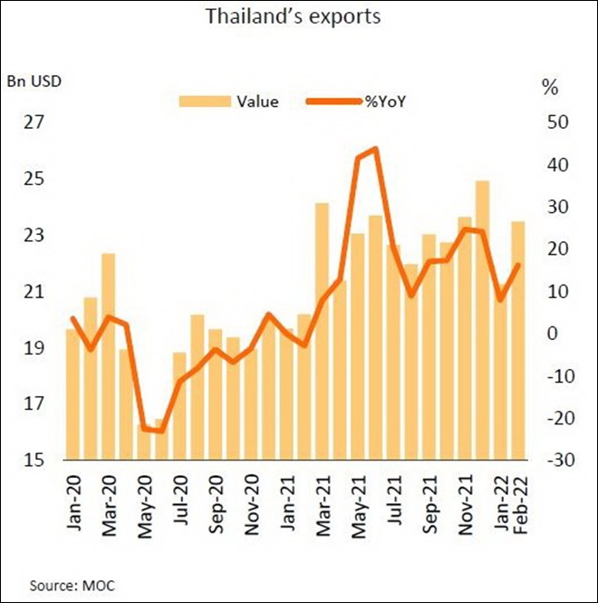 ในช่วงต้นปี (มกราคม-กุมภาพันธ์) เครื่องชี้เศรษฐกิจด้านต่างประเทศของไทยมีสัญญาณเชิงบวกทั้งภาคส่งออกและภาคท่องเที่ยว อย่างไรก็ตาม ในระยะถัดไปยังมีปัจจัยลบจากผลกระทบของการสู้รบระหว่างรัสเซียและยูเครนที่ปะทุขึ้นตั้งแต่ปลายเดือนกุมภาพันธ์และมีความเสี่ยงจะยืดเยื้อไปถึงไตรมาส 2 อย่างไรก็ตาม แม้ผลกระทบทางตรงต่อการส่งออกของไทยอยู่ในวงจำกัด เนื่องจากการส่งออกไปรัสเซียและยูเครนคิดเป็นเพียง 0.38% และ 0.05% ของการส่งออกทั้งหมดของไทยในปี 2564 ตามลำดับ