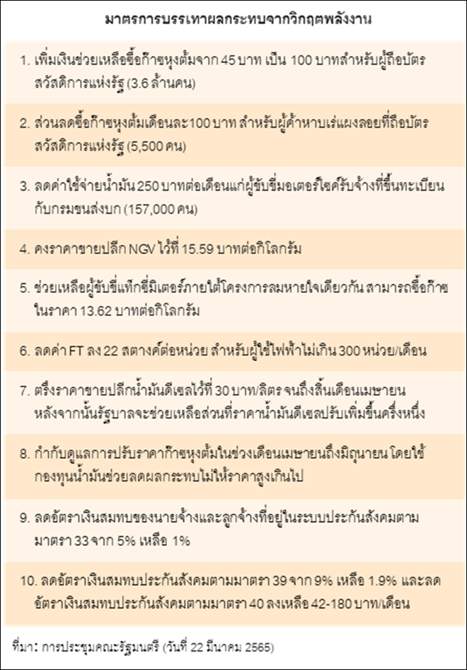 มาตรการบรรเทาผลกระทบจากวิกฤตพลังงานวงเงินกว่า 8 หมื่นล้านบาท ทางการคาด GDP ยังเติบโตได้ที่ 3% ล่าสุดรัฐบาลอนุมัติ 10 มาตรการลดภาระค่าครองชีพช่วยเหลือประชาชน (ดังตาราง) เป็นมาตรการระยะสั้น 3 เดือน คาดจะเริ่มดำเนินการได้ตั้งแต่เดือนพฤษภาคม ถึงเดือนกรกฎาคม 2565 ทั้งนี้ รัฐบาลระบุวงเงินที่ใช้สำหรับดำเนินมาตรการข้างต้นรวมทั้งสิ้น 80,247 ล้านบาท แบ่งเป็น i) กองทุนน้ำมันเชื้อเพลิง (เงินกู้) วงเงิน 39,520 ล้านบาท ii) กองทุนประกันสังคม (ปรับลดเงินสมทบ) วงเงิน 35,224 ล้านบาท iii) งบกลางจากงบประมาณรายจ่ายประจำปี 2565 วงเงิน 3,740 ล้านบาท และ iv) บมจ. ปตท. (PTT) วงเงิน 1,763 ล้านบาท