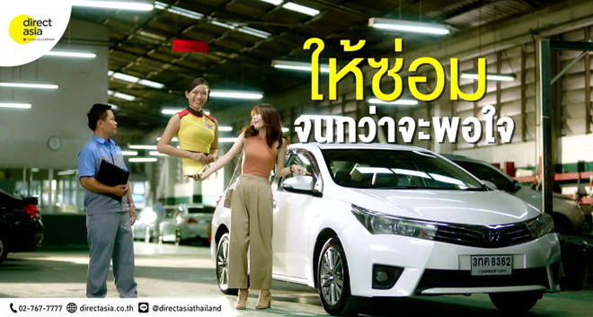 ทั้งนี้เราได้เลือกนักแสดงที่เป็นผู้หญิง เพื่อต้องการสื่อให้เห็นว่าแม้ลูกค้าจะไม่ถนัดเรื่องรถยนต์ แต่ยังมี ไดเร็ค เอเชีย คอยช่วยดูแลในทุกมิติของรถยนต์เสมอ ไม่ว่าจะเป็นการประสานงานซ่อมจนกว่าลูกค้าจะพอใจ เคลมไวถึงจุดเกิดเหตุภายใน 30 นาที ติดต่อกลับทันทีใน 5 วินาที จำนวนอู่บริการที่มีคุณภาพได้มาตรฐาน ช่างซ่อมที่มีฝีมือเฉพาะทาง หรือสิทธิพิเศษที่คัดสรรมาเพื่อลูกค้าคนสำคัญ และการรับประกันงานซ่อมทั้งตัวถังและงานสี”