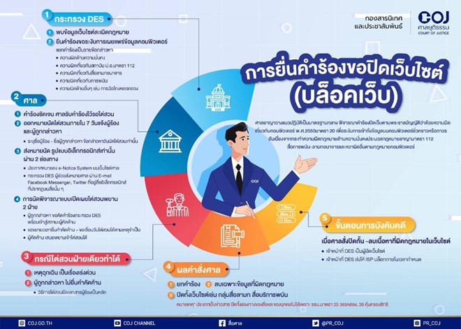 นายมุขเมธิน กลั่นนุรักษ์ ผู้พิพากษาหัวหน้าคณะแผนกคดีค้ามนุษย์ ซึ่งได้รับมอบหมายโดยตรงจากอธิบดีผู้พิพากษาศาลอาญา รับผิดชอบคดียื่นคำร้องขอปิดเว็บไซต์ ระงับการเข้าถึงข้อมูลบนคอมพิวเตอร์ กล่าวถึงการกำหนดแนวทางมาตรฐานการพิจารณาของศาลอาญา หลังจากมีการยื่นคำร้องสู่ศาลอาญาต่อเนื่อง นับตั้งแต่ พ.ร.บ.ว่าด้วยการกระทำความผิดเกี่ยวกับคอมพิวเตอร์ พ.ศ.2550 บังคับใช้ว่า จากกรณีศึกษาการยื่นคำร้องของกระทรวงดิจิทัลเพื่อเศรษฐกิจและสังคม หรือ DES กับบริษัท วอยซ์ทีวี จำกัด ในคดีหมายเลขแดง พศ.339/2563 ที่ขอให้ปิดทีวีทั้งช่อง ซึ่งตามรัฐธรรมนูญฯ มาตรา 35 วรรคสอง เขียนว่าห้ามรัฐปิดสื่อมวลชนเพื่อริดรอนสิทธิเสรีภาพการนำเสนอข่าวสาร ดังนั้นการสั่งปิดสื่อจึงทำไม่ได้โดยเด็ดขาด ส่วนวิธีการดำเนินกระบวนการพิจารณาเพื่อมีคำสั่งใด ๆ เกี่ยวกับคำร้องขอการระงับการเข้าถึงข้อมูลบนเว็บไซต์ พ.ร.บ.ว่าด้วยการกระทำความผิดเกี่ยวกับคอมพิวเตอร์ฯ มาตรา 20 วรรคสี่ ระบุเพียงว่าให้นำวิธีการตามประมวลกฎหมายวิธีพิจารณาความอาญามาบังคับใช้โดยอนุโลม เราจึงต้องตีความตัวบทกฎหมายมากำหนดเป็นแนวทางพิจารณาของศาลอาญาให้ชัดเจน ถูกต้องในทางนิติศาสตร์เป็นมาตรฐานเดียวกันและสอดคล้องตามหลักสากล
