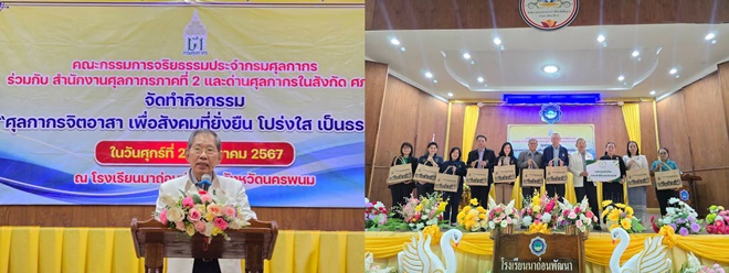 ศาสตราจารย์พิเศษ วิชา มหาคุณ ประธานคณะกรรมการจริยธรรมประจำกรมศุลกากร นายมนัส แจ่มเวหา และศาสตราจารย์ ดร. สกนธ์ วรัญญูวัฒนา กรรมการจริยธรรมประจำกรมศุลกากร พร้อมด้วยนางนันท์ฐิตา ศิริคุปต์ รษก. ที่ปรึกษาด้านพัฒนาระบบควบคุมทางศุลกากร นายยุทธนา พูลพิพัฒน์ รองอธิบดีกรมศุลกากร เเละนางอาภาพรรณี แสงมุกดา ผู้อำนวยการกองบริหารทรัพยากรบุคคล ร่วมด้วยนางสาวลติตา อรรถพิมล ผู้อำนวยการสำนักงานศุลกากรภาคที่ 2 นางชนัยพร พูนน้อย นายด่านศุลกากรนครพนม และด่านศุลกากรในสังกัด ศภ.2 จัดกิจกรรม “ศุลกากรจิตอาสา เพื่อสังคมที่ยั่งยืน โปร่งใสเป็นธรรม” ณโรงเรียนนาถ่อนพัฒนา อำเภอธาตุพนม จังหวัดนครพนม