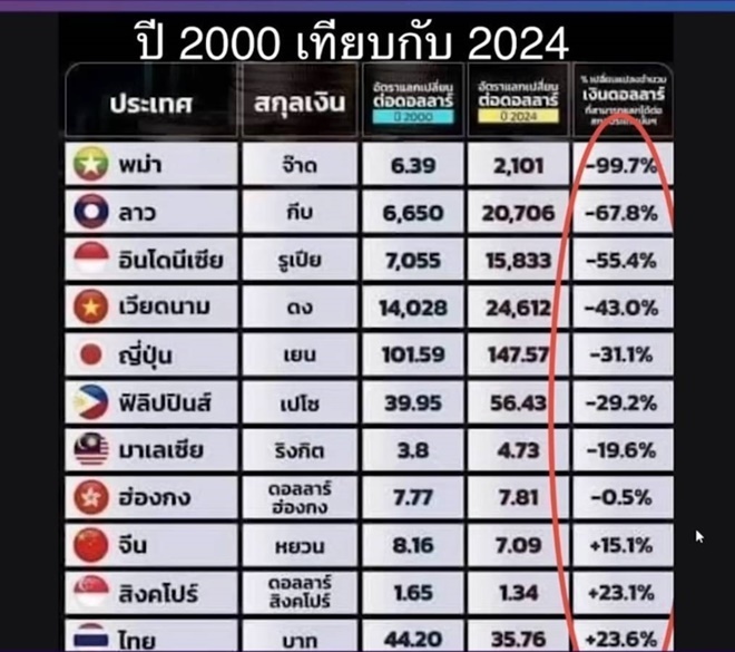 –  การส่งออก & ท่องเที่ยวน้อย​ เพราะค่าเงินบาทแข็งเกินไป​มาก แข็งกว่าเกือบทุกประเทศในโลก (ดูตาราง) ค่าเงินบาทที่แข็ง​มากเกินไป​ เป็นเพราะ​ดอกเบี้ยสูงไป, และการเพิ่มปริมาณ​เงินบาทในระบบเศรษฐกิจ​เรา​ต่ำไป, ต่ำกว่าทั่วโลกมาก​, มีผลให้เงินเฟ้อเราต่ำกว่าเงิน​เฟ้อโลก​มากเกินไป