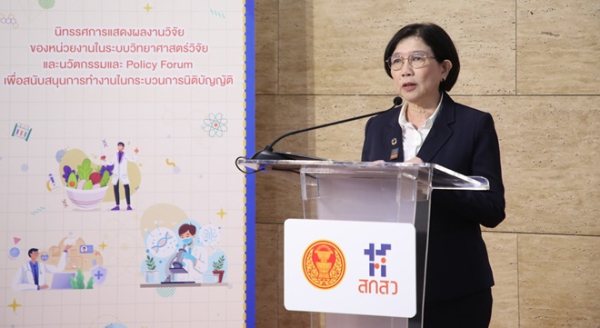 รศ. ดร.ปัทมาวดี โพชนุกูล ผู้อำนวยการ สกสว. กล่าวว่า จากการลงนามบันทึกข้อตกลงความร่วมมือกับสำนักงานเลขาธิการสภาผู้แทนราษฎร และสำนักงานเลขาธิการวุฒิสภา ว่าด้วยการนำผลงานทางวิชาการและผลการวิจัยไปใช้ประโยชน์ในกระบวนการนิติบัญญัติ แล้วนั้น ทาง สกสว. มีบทบาทหน้าที่เป็นหน่วยงานบริหารจัดการกองทุนส่งเสริมวิทยาศาสตร์ วิจัยและนวัตกรรม (กองทุน ววน.) มีหน้าที่ในการ 1) จัดทำแผนด้านวิทยาศาสตร์ วิจัยและนวัตกรรม (ววน.) 2) จัดสรรงบประมาณจากกองทุน ววน. ให้แก่หน่วยบริหารและจัดการทุน 9 แห่ง และหน่วยงานในระบบ ววน. ทั้งในและนอกกระทรวง อว. รวมถึงสถาบันอุดมศึกษากว่า 180 แห่ง 3) เสริมพลังและขับเคลื่อนระบบ ววน. 4) สร้างระบบการนำผลงานวิจัยและนวัตกรรมไปใช้ประโยชน์ และ 5) ติดตามประเมินผลด้าน ววน. ของประเทศ