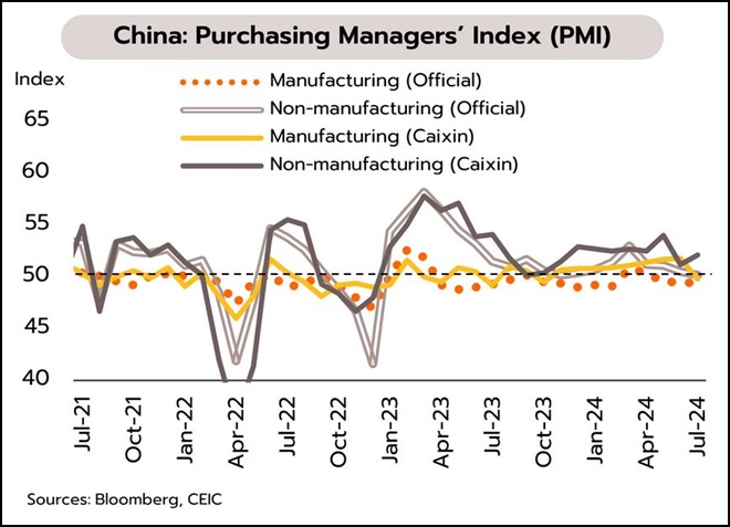 ภาคการผลิตของจีนหดตัวในช่วงต้นไตรมาส 3 ภาคบริการโตต่ำสุดในปีนี้ ทางการกระตุ้นการบริโภค คาดผลเชิงบวกจำกัด ภาคเอกชนโดย Caixin รายงานว่ากิจกรรมภาคการผลิตในเดือนกรกฎาคมหดตัวเป็นครั้งแรกนับตั้งแต่เดือนตุลาคม 2566 ที่ระดับ 49.8 หลังจากขยายตัวในเดือนมิถุนายนที่ 51.8 สอดคล้องกับการรายงานของทางการที่ระบุว่ากิจกรรมภาคการผลิตในเดือนเดียวกันลดลงสู่ระดับต่ำสุดนับตั้งแต่เดือนกุมภาพันธ์และหดตัวต่อเนื่องเป็นเดือนที่ 3 ที่ 49.4 ในเดือนกรกฎาคม จาก 49.5 ในเดือนมิถุนายน ส่วนกิจกรรมภาคบริการเติบโตในอัตราต่ำสุดนับตั้งแต่เดือนพฤศจิกายน 2566 ที่ระดับ 50.2 จาก 50.5 ในเดือนก่อนหน้า