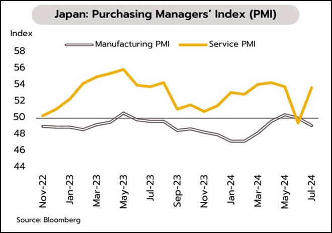 ธนาคารกลางญี่ปุ่น(BOJ) ขึ้นดอกเบี้ย พร้อมประกาศลดวงเงินซื้อพันธบัตรรายเดือนลงครึ่งหนึ่ง ในเดือนกรกฎาคม ดัชนี PMI ภาคการผลิตพลิกกลับมาหดตัวเป็นครั้งแรกในรอบ 6 เดือนอยู่ที่ 49.2 ส่วนดัชนี PMI ภาคบริการกลับมาขยายตัวที่ 53.9 สูงสุดในรอบ 4 เดือน ในส่วนของรายงานยอดขายของผู้ค้าปลีกรายใหญ่โต 7% YoY ในเดือนมิถุนายน ขยายตัวต่อเนื่องเป็นเดือนที่ 3