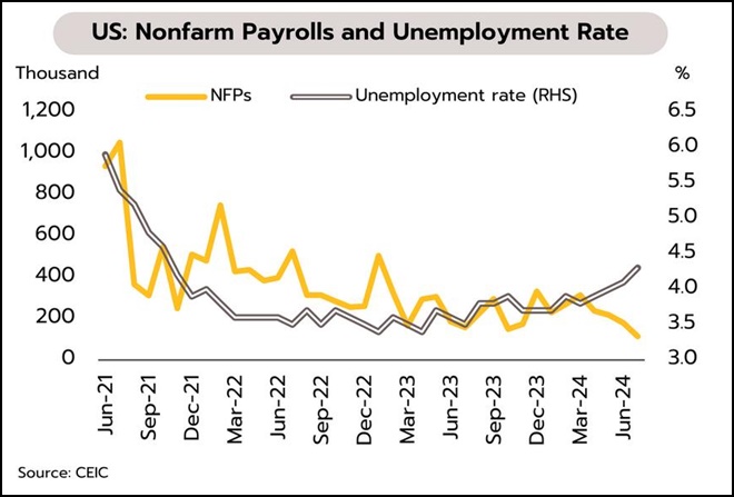 สัญญาณการปรับลดดอกเบี้ยในเดือนกันยายนชัดเจนขึ้นหลังตลาดแรงงานชะลอตัว รวมถึงเงินเฟ้อมีความคืบหน้าในการปรับตัวสู่เป้าหมายที่ 2% ในเดือนกรกฎาคม ตัวเลขการจ้างงานนอกภาคเกษตรเพิ่มขึ้นเพียง 114,000 ตำแหน่ง จากเดือนก่อนที่ 179,000 ตำแหน่ง ชะลอตัวมากสุดนับตั้งแต่เดือนธันวาคม 2564 ส่วนอัตราการว่างงานปรับตัวเพิ่มขึ้นสู่ระดับ 4.3% สูงสุดนับตั้งแต่เดือนตุลาคม 2564 ขณะที่ ตัวเลขค่าจ้างรายชั่วโมงโดยเฉลี่ยของแรงงานเพิ่มขึ้น 3.6% YoY ชะลอลงจากเดือนก่อนหน้าที่ 3.8%
