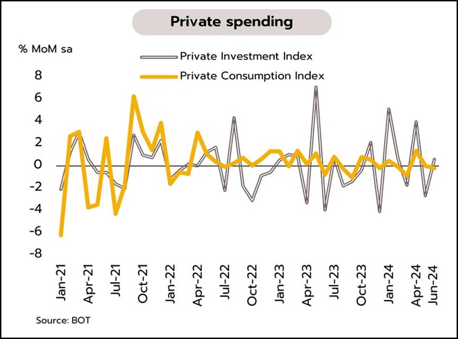 ทั้งนี้ ยังต้องติดตามสถานการณ์การเมืองไทย ซึ่งอาจกระทบความเชื่อมั่นและอาจส่งผลต่อแนวโน้มการลงทุนของภาคเอกชนในระยะถัดไป (วันที่ 7 สิงหาคม ศาลรัฐธรรมนูญนัดฟังคำวินิจฉัยคดียุบพรรคก้าวไกล และวันที่ 14 สิงหาคม ฟังคำวินัยฉัยคดีถอดถอนนายกรัฐมนตรี นายเศรษฐา ทวีสิน)