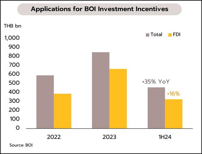 มูลค่ายอดขอรับส่งเสริมการลงทุนในช่วงครึ่งปีแรกขยายตัวถึง 35% แต่เครื่องชี้อื่นๆ สะท้อนว่าการลงทุนในระยะนี้อาจยังฟื้นตัวช้า สำนักงานคณะกรรมการส่งเสริมการลงทุน (BOI) เผยในช่วงครึ่งแรกของปี 2567 มียอดขอรับส่งเสริมการลงทุนจำนวน 1,412 โครงการ (+64% YoY) เงินลงทุน 458.4 พันล้านบาท (+35% YoY) กลุ่มอุตสาหกรรมเป้าหมายที่มีมูลค่าสูงสุด ได้แก่ อิเล็กทรอนิกส์และเครื่องใช้ไฟฟ้า (139.7 พันล้านบาท) ยานยนต์และชิ้นส่วน (39.9 พันล้านบาท) เกษตรและแปรรูปอาหาร (33.1 พันล้านบาท) ปิโตรเคมีและเคมีภัณฑ์ (25.3 พันล้านบาท) และอุตสาหกรรมดิจิทัล (25.1 พันล้านบาท) สำหรับการลงทุนจากต่างประเทศ (FDI) มีโครงการยื่นขอรับส่งเสริมจำนวน 889 โครงการ (+83% YoY) เงินลงทุน 325.7 พันล้านบาท (+16% YoY) ประเทศที่มีมูลค่าลงทุนสูงสุด ได้แก่ สิงคโปร์ จีน ฮ่องกง ญี่ปุ่น และไต้หวัน