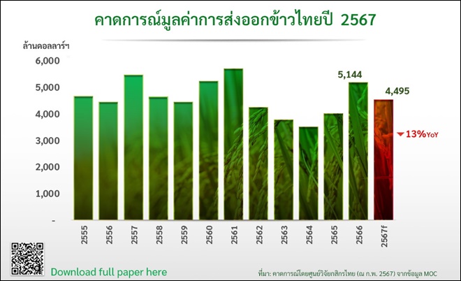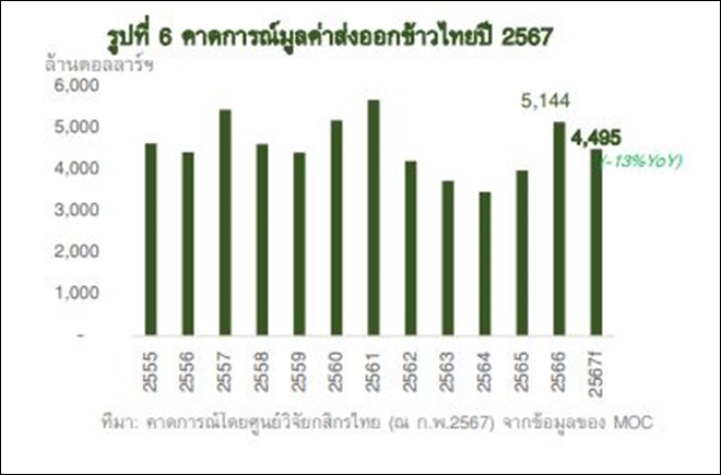 โดยสรุป ศูนย์วิจัยกสิกรไทย คาดว่า ในปี 2567 ภาพรวมมูลค่าส่งออกข้าวไทยอาจลดลงร้อยละ 13 (YoY) จาก 5,144 ล้านดอลลาร์สหรัฐฯ เป็น 4,495 ล้านดอลลาร์สหรัฐฯ (รูปที่ 6) เนื่องจากปริมาณการส่งออกข้าวลดลงร้อยละ 10 (YoY) จาก 8.8 ล้านตัน เป็น 7.9 ล้านตัน และราคาส่งออกข้าวเฉลี่ยลดลงร้อยละ 3 (YoY) จาก 587 ดอลลาร์สหรัฐฯต่อตัน เป็น 569 ดอลลาร์สหรัฐฯต่อตัน โดยสาเหตุหลักมาจากแรงฉุดของมูลค่าการส่งออกข้าวขาวที่ลดลงทั้งในด้านปริมาณและราคา เนื่องจากอินเดียอาจกลับมาส่งออกข้าวขาวหลังการเลือกตั้ง
