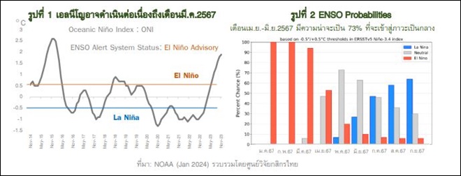 - มองต่อในปี 2567 การส่งออกข้าวไทยคงลดลง จากคำสั่งซื้อใหม่ของผู้ซื้อหลักที่อาจลดลงจากที่ได้เร่งนำเข้าไปแล้วในปีก่อน แม้บางส่วนจะถูกชดเชยด้วยการขายข้าวแบบรัฐต่อรัฐกับอินโดนีเซียและจีน ขณะที่ไทยคงเผชิญเอลนีโญในช่วงไตรมาสแรกของปี ที่จะทำให้เกิดภัยแล้ง สะท้อนจากข้อมูลของ NOAA ที่คาดว่า เอลนีโญที่กำลังดำเนินอยู่จากดัชนี Ocean Nino Index (ONI) ที่สูงกว่า 0.5 องศาเซลเซียส อาจต่อเนื่องถึงในเดือนมี.ค.2567 (รูปที่ 1) อีกทั้งปริมาตรน้ำใช้การได้ในอ่างเก็บน้ำขนาดใหญ่ทั้งประเทศ ณ 7 ก.พ.2567 ลดลงร้อยละ 8 (YoY) กดดันผลผลิตข้าวนาปรัง อย่างไรก็ตาม มีความเป็นไปได้ที่เอลนีโญจะอ่อนกำลังลงและเข้าสู่ภาวะเป็นกลางมากขึ้นตั้งแต่เดือนเม.ย.2567 (รูปที่ 2) จึงอาจกระทบผลผลิตข้าวนาปีไม่มาก ส่งผลต่อภาพรวมผลผลิตข้าวไทยในปีนี้ให้ยังอยู่ในระดับสูงที่ราว 31 ล้านตันข้าวเปลือก ซึ่งมีเพียงพอเพื่อการส่งออก