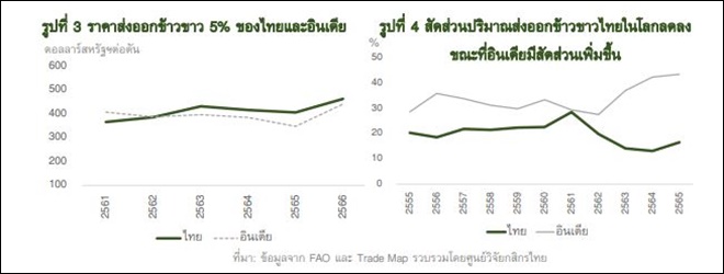 ดังนั้น จากการที่อินเดียน่าจะกลับมาส่งออกข้าว ทำให้ไทยเผชิญการแข่งขันด้านราคากับอินเดีย จะกดดันการส่งออกข้าวขาวไทยในปี 2567 ให้ลดลงร้อยละ 17 (YoY) (จาก 4.8 ล้านตันเป็น 4 ล้านตัน) ซึ่งเป็นประเภทข้าวที่ไทยส่งออกมากที่สุด คิดเป็นร้อยละ 51 ของปริมาณการส่งออกข้าวทั้งหมดของไทย ทั้งนี้ ไทยมีราคาส่งออกข้าวขาวสูงกว่าอินเดีย (รูปที่ 3) กระทบส่วนแบ่งตลาดส่งออกข้าวขาวไทยในตลาดโลกให้ลดลง (รูปที่ 4)