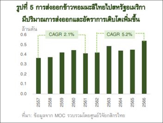 - แม้ว่าการส่งออกข้าวขาวจะมีปริมาณลดลง แต่ไทยยังมีโอกาสในการส่งออกข้าวหอมมะลิ โดยศูนย์วิจัยกสิกรไทย คาดว่า ไทยอาจมีปริมาณส่งออกข้าวหอมมะลิเพิ่มขึ้นร้อยละ 5 (YoY) (จาก 1.32 ล้านตันเป็น 1.39 ล้านตัน) โดยข้าวหอมมะลิแม้จะมีสัดส่วนปริมาณส่งออกไม่มากที่ร้อยละ 18 แต่เป็นข้าวเกรดพรีเมียมที่มีราคาขายสูง มีคุณภาพและมีโอกาส โดยเฉพาะในสหรัฐอเมริกาที่เป็นตลาดส่งออกข้าวหอมมะลิอันดับ 1 ของไทย ซึ่งเติบโตเพิ่มขึ้นจากเฉลี่ยร้อยละ 2.1 ต่อปีในปี 2557-2561 เป็นเฉลี่ยร้อยละ 5.2 ต่อปีในปี 2562-2566 (รูปที่ 5)