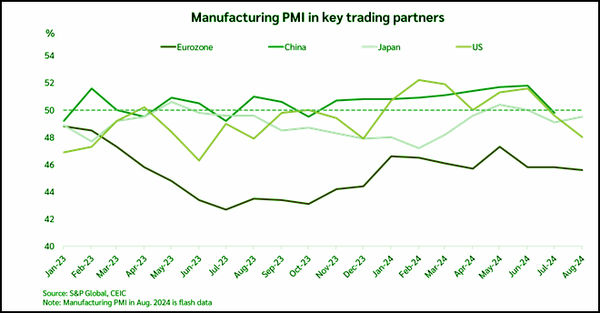 อย่างไรก็ดี ถึงแม้ว่าการส่งออกไทยจะขยายตัวได้สูงในเดือนก.ค.67 แต่ภาพการส่งออกไทยยังมีปัจจัยกดดันจากเศรษฐกิจโลกที่ชะลอตัวและกำลังซื้อของประเทศคู่ค้าอ่อนแอลง โดยดัชนีผู้จัดการฝ่ายจัดซื้อ (PMI) ภาคการผลิตของประเทศคู่ค้าสำคัญของไทยในเดือนก.ค. และส.ค.67 เกือบทั้งหมดอยู่ระดับต่ำกว่า 50 ซึ่งอาจเป็นปัจจัยลบต่อการส่งออกสินค้าไทยในระยะข้างหน้า (รูปที่ 3)