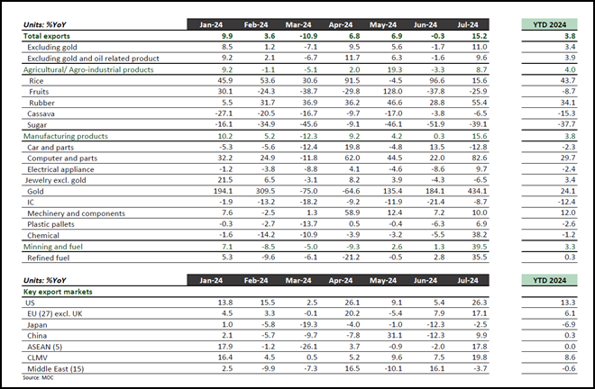 การส่งออกไทยในเดือนก.ค.67 ขยายตัว 15.2%YoY สูงกว่าที่ตลาดคาดการณ์ที่ 7.0%YoY โดยเป็นผลของฐานที่ต่ำในเดือนก.ค.66 อาทิ การส่งออกน้ำมันสำเร็จรูปที่ลดลงตามราคาของตลาดโลกในขณะนั้น ประกอบกับการส่งออกไทยในเดือนก.ค.67 ได้รับปัจจัยหนุนสำคัญจากการส่งออกทองคำที่ขยายตัวถึง 434.1%YoY จากปัจจัยด้านปริมาณและราคา ท่ามกลางความตึงเครียดในตะวันออกกลางที่ยังมีอยู่และธนาคารกลางหลักโดยเฉพาะสหรัฐฯ มีแนวโน้มปรับลดดอกเบี้ยในระยะอันใกล้ หากหักทองคำออก การส่งออกของไทยเดือนก.ค. 67 ขยายตัวที่ 11.0% (รูปที่ 1)