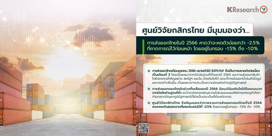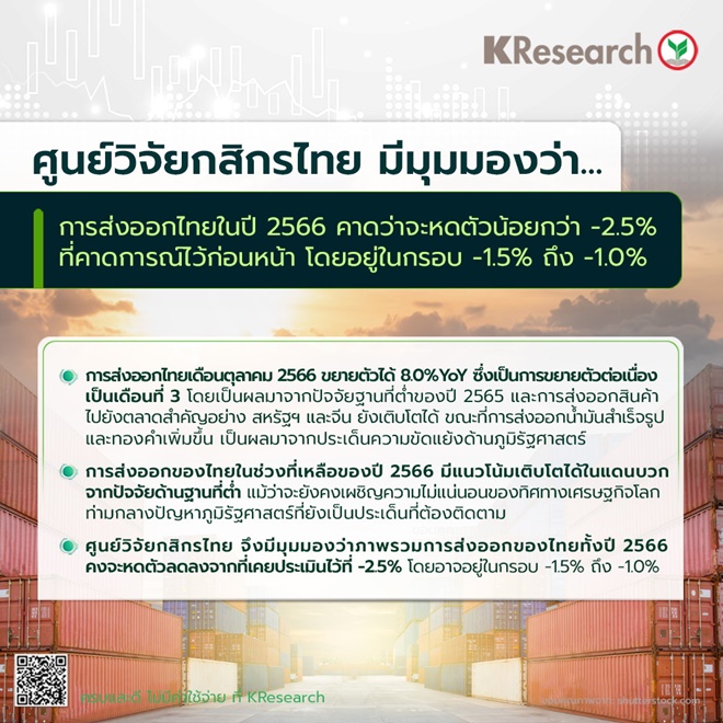 - ศูนย์วิจัยกสิกรไทยมีมุมมองว่า การส่งออกของไทยในช่วงที่เหลือของปี 2566 มีแนวโน้มเติบโตได้ในแดนบวก จากปัจจัยด้านฐานที่ต่ำ แม้ว่าจะยังคงเผชิญความไม่แน่นอนของทิศทางเศรษฐกิจโลกท่ามกลางปัญหาภูมิรัฐศาสตร์ที่ยังเป็นประเด็นที่ต้องติดตาม ดังนั้น ศูนย์วิจัยกสิกรไทยจึงมีมุมมองว่า ภาพรวมการส่งออกของไทยทั้งปี2566 คงจะหดตัวลดลงจากที่เคยประเมินไว้ที่ -2.5% โดยอาจอยู่ในกรอบ -1.5% ถึง-1.0%