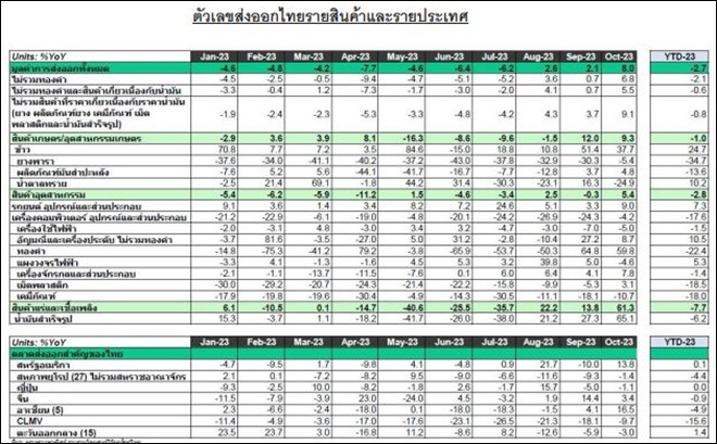 - การส่งออกไทยในเดือนตุลาคม 2566 ขยายตัวได้ถึง 8.0%YoY ซึ่งเป็นการขยายตัวต่อเนื่องในเดือนที่ 3 โดยปัจจัยที่มีผลต่อการขยายตัวในเดือนดังกล่าวมาจากฐานที่อยู่ในระดับต่ำของปีก่อนหน้า และการส่งออกสินค้าไปยังตลาดสำคัญอย่างสหรัฐฯ เติบโตได้มากถึง 13.8%YoY และการส่งออกผลไม้ไปจีนก็ยังขยายตัวต่อเนื่อง ขณะที่การส่งออกน้ำมันสำเร็จรูปของไทยเพิ่มขึ้นตามราคาน้ำมันในตลาดโลก อีกทั้งการส่งออกทองคำในฐานะสินทรัพย์ปลอดภัยก็เพิ่มขึ้นเช่นกันอันเป็นผลมาจากประเด็นความขัดแย้งด้านภูมิรัฐศาสตร์