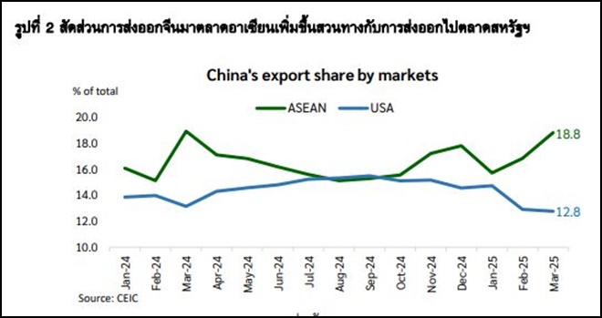 2) แม้สหรัฐฯ มีแนวโน้มปรับลดอัตราภาษีนำเข้าสินค้าจากจีนลงราวครึ่งหนึ่งจากระดับ 145% แต่อัตราดังกล่าวยังคงสูงกว่าที่เรียกเก็บจากประเทศอื่นอย่างมีนัยสำคัญ ส่งผลให้ไทยต้องเผชิญแรงกดดันด้านการแข่งขันจากสินค้าจีนที่เพิ่มขึ้นทั้งในตลาดโลกและภายในประเทศ โดยเฉพาะสัดส่วนการส่งออกของจีนไปอาเซียนเพิ่มขึ้นต่อเนื่อง สวนทางสัดส่วนการส่งออกไปสหรัฐฯ ที่ลดลง