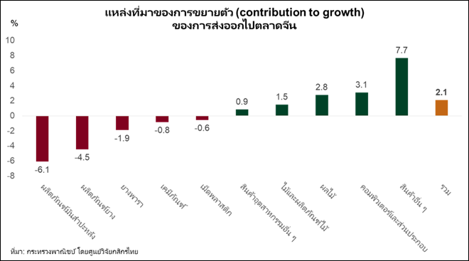นอกจากนี้ การส่งออกไทยไปจีนในเดือน ม.ค. 67 ขยายตัวเป็นบวกต่อเนื่องเป็นเดือนที่ 2 ที่ 2.1%YoY โดยผลไม้กลับมาเป็นแรงหนุนสำคัญ (รูปที่ 2) อย่างไรก็ตาม การส่งออกทุเรียนสดยังคงหดตัวเป็นเดือนที่ 3 เพราะอยู่นอกฤดูกาลส่งมอบสินค้า แต่การส่งออกลำไยและมังคุดสดที่เพิ่มขึ้นเข้ามาสนับสนุน รวมถึงการหนุนจากสินค้าส่งออกอื่นๆ อาทิ คอมพิวเตอร์และส่วนประกอบ และแผงวงจรไฟฟ้า ที่ส่วนหนึ่งเป็นอานิสงส์จากความต้องการสินค้าในตลาดจีนที่มีมากขึ้นในช่วงตรุษจีนเดือน ก.พ.67 และปัจจัยฐานที่ต่ำ