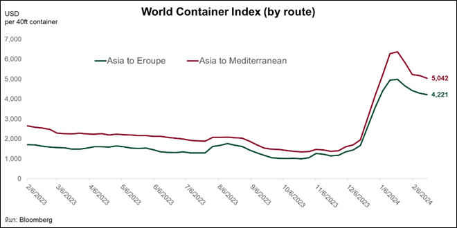ท่ามกลางความขัดแย้งในทะเลแดงที่ส่งผลกระทบต่อระยะเวลาและต้นทุนการขนส่งที่เพิ่มขึ้น แต่การส่งออกของไทยไปตลาดยูโรโซนในเดือน ม.ค. 67 ยังคงขยายตัวที่ 4.5%YoY และนับเป็นการขยายตัวครั้งแรกในรอบ 8 เดือน โดยมีการส่งออกรถยนต์ และ อัญมณีและเครื่องประดับ ที่เพิ่มขึ้น ในขณะที่เหตุการณ์ในทะเลแดงยังคงยืดเยื้อมายังเดือน ก.พ. 67 และหากเหตุการณ์ไม่ยกระดับขึ้น คาดว่าค่าขนส่งได้ผ่านจุดสูงสุดมาแล้ว (รูปที่ 3) ซึ่งช่วยลดแรงกดดันที่มีต่อการส่งออกสินค้าไทย อย่างไรก็ตาม สถานการณ์ดังกล่าวก็ยังเป็นประเด็นที่ยังต้องติดตามอย่างใกล้ชิด