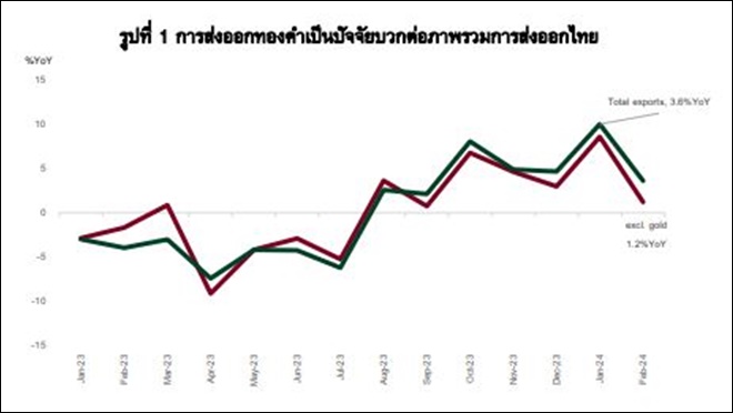 นอกจากนี้ การส่งออกทองคำในเดือน ก.พ. 67 ขยายตัวสูง 309.5%YoY ส่วนหนึ่งเป็นผลมาจากปัจจัยด้านราคาและฐานที่ต่ำในช่วงเดียวกันของปีก่อนหน้า ส่งผลให้เมื่อหักทองคำการส่งออกไทยเดือน ก.พ. 67 จะขยายตัวอยู่ที่ 1.2%YoY (รูปที่ 1) ทั้งนี้ แนวโน้มการส่งออกทองคำคาดว่าจะยังขยายตัวเป็นบวกตามแนวโน้มราคาที่เพิ่มขึ้น ท่ามกลางความไม่แน่นอนของปัญหาภูมิรัฐศาสตร์ที่ยังคงมีอยู่ และทิศทางนโยบายการเงินของธนาคารกลางหลักของโลกที่อาจปรับลดลงในช่วงครึ่งหลังของปี 2567