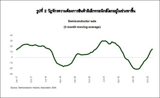 การส่งออกสินค้าอิเล็กทรอนิกส์ไทยในปี 2567 คาดว่าจะได้รับอานิสงส์ตามรอบวัฏจักรความต้องการสินค้าในตลาดโลกที่ฟื้นตัว สะท้อนผ่านยอดขายเซมิคอนดักเตอร์ซึ่งเป็นชิ้นส่วนสำคัญในการผลิตอุปกรณ์อิเล็กทรอนิกส์ในตลาดโลกที่เพิ่มขึ้นต่อเนื่องตั้งแต่ไตรมาสแรกของปี 2566 (รูปที่ 2) โดยการส่งออกสินค้าอิเล็กทรอนิกส์ไทยเดือน ก.พ. 67 เพิ่มขึ้น 12.5%YoY ขยายตัวเป็นเดือนที่ 5 ติดต่อกัน และการส่งออกสินค้าสำคัญในกลุ่มดังกล่าวที่ยังขยายตัวได้ดี ได้แก่ ฮาร์ดดิสก์ไดร์ฟ (HDD) อุปกรณ์กึ่งตัวนำ ทรานซิสเตอร์และไดโอด ขณะที่แผงวงจรไฟฟ้าหดตัวเป็นเดือนที่ 2 ติดต่อกันที่ -13.2%YoY จากการส่งออกไปตลาดฮ่องกงและสิงคโปร์ที่ลดลง จากความต้องการสินค้ากลุ่มหน่วยความจำในตลาดโลกชะลอตัวในเดือนก.พ. 67