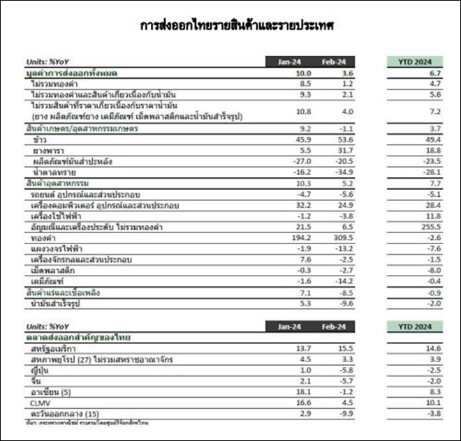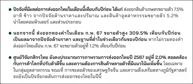 การส่งออกไทยในเดือน ก.พ. 67 ขยายตัวเป็นเดือนที่ 7 ติดต่อกันที่ 3.6%YoY โดยปัจจัยที่มีผลต่อการส่งออกไทยในเดือนนี้ ได้แก่ การส่งออกสินค้าเกษตรขยายตัว 7.5%YoY อาทิ ข้าว จากปัจจัยด้านราคาและปริมาณ และการส่งออกสินค้าอุตสาหกรรมขยายตัว 5.2%YoY นำโดยการส่งออกคอมพิวเตอร์และส่วนประกอบ นอกจากนี้ การส่งออกไปยังตลาดคู่ค้าสำคัญยังขยายตัวอยู่ เช่น สหรัฐฯ ยูโรโซน เป็นต้น ขณะที่การส่งออกไปจีนและญี่ปุ่นกลับมาหดตัวในรอบ 3 และ 2 เดือน ตามลำดับ จากการเร่งนำเข้าสินค้าให้ทันช่วงเทศกาลตรุษจีนของจีนในช่วงก่อนหน้า และภาคการผลิตของทั้งสองประเทศที่ยังซบเซา