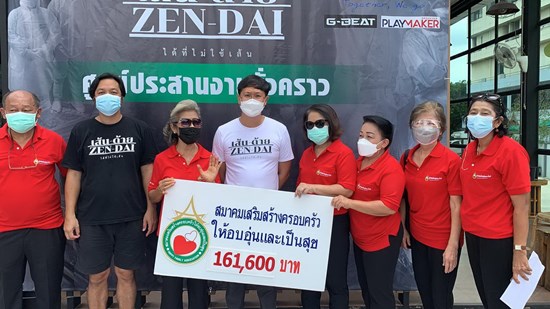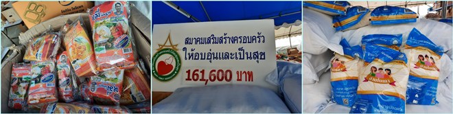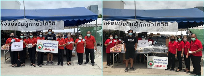 “โดยทางสมาคมได้รวมรวมเงินของผู้มีจิตศัทธาทั้งหลายและเงินของสมาคมได้จำนวน 161,600 บาท แล้วนำไปจัดหาสิ่งของต่าง ๆ มาบริจาค ไม่ว่าจะเป็นชุดตรวจโควิด -19 จำนวน 320 ชุด ซึ่งทราบว่าเป็นที่ต้องการมาก รวมทั้งข้าวสาร จำนวน 510 ถุง ๆ 5 กิโลกรัม และ อาหารแห้งที่จะนำไปบริจาค ส่วนข้าวมันไก่นั้นทราบว่าทีมคุณหมอพยาบาลและเจ้าหน้าที่ที่มาช่วยงาน ซึ่งวันนี้การหาร้านค้าหรืออาหารลำบากมากและที่สำคัญทุกคนที่มาทำงานที่นี่กว่า 50 ชีวิต ก็เป็นจิตอาสาทั้งสิ้น และที่สำคัญในภาวะอย่างนี้ ใครที่ทำงานเพื่อผู้ยากลำบาก ทางสมาคมฯ เราพร้อมสนับสนุน ที่ผ่านมาก็ได้บริจาคผ่านสถานีโทรทัศน์ ไม่ว่าจะเป็น ช่อง 3 , Thai PBS, และช่อง 8 เพื่อสนับสนุนในการช่วยเหลือแบ่งปัน เชื่อว่าเราจะสามารถรอดพ้นไปได้ ถ้าทุกคนร่วมด้วยช่วยกัน คนละเล็ก คนละน้อย ช่วยเหลือซึ่งกันละกัน” นางระเบียบรัตน์ฯ กล่าว