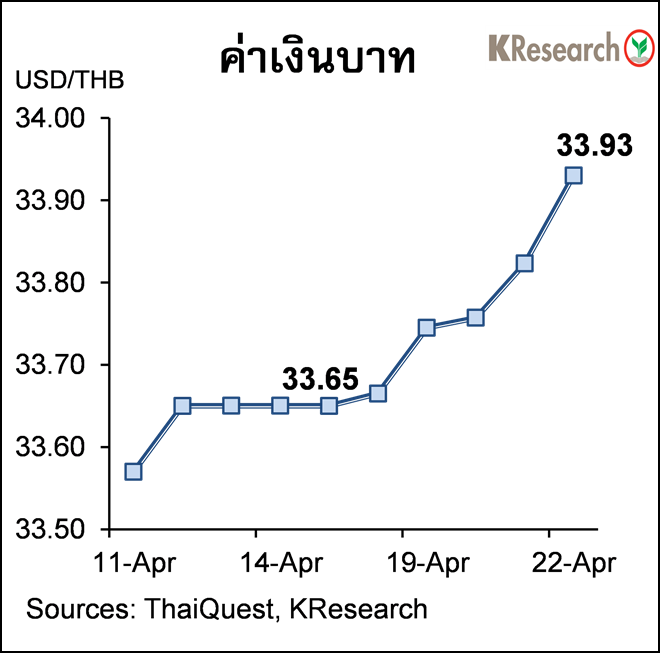 ในวันศุกร์ (22 เม.ย.) เงินบาทปิดตลาดที่ 33.93 บาทต่อดอลลาร์ฯ เทียบกับระดับ 33.65 บาทต่อดอลลาร์ฯ ในวันอังคารก่อนหน้า (12 เม.ย.) ขณะที่ระหว่างวันที่ 18-22 เม.ย. นักลงทุนต่างชาติซื้อสุทธิหุ้นไทย 3,292.46 ล้านบาท แต่มีสถานะเป็น NET OUTFLOW ในตลาดพันธบัตร 11,686 ล้านบาท (มาจาก การขายสุทธิพันธบัตร 4,167 ล้านบาท และตราสารหนี้หมดอายุ 7,519 ล้านบาท)