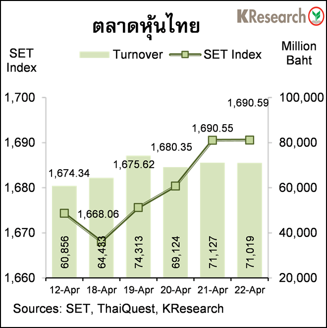 ในวันศุกร์ (22 เม.ย.) ดัชนี SET ปิดที่ระดับ 1,690.59 จุด เพิ่มขึ้น 0.97% จากสัปดาห์ก่อน ขณะที่มูลค่าการซื้อขายเฉลี่ยต่อวันอยู่ที่ 70,003.12 ล้านบาท เพิ่มขึ้น 13.26% จากสัปดาห์ก่อน ส่วนดัชนี mai เพิ่มขึ้น 5.07% มาปิดที่ 688.90 จุด