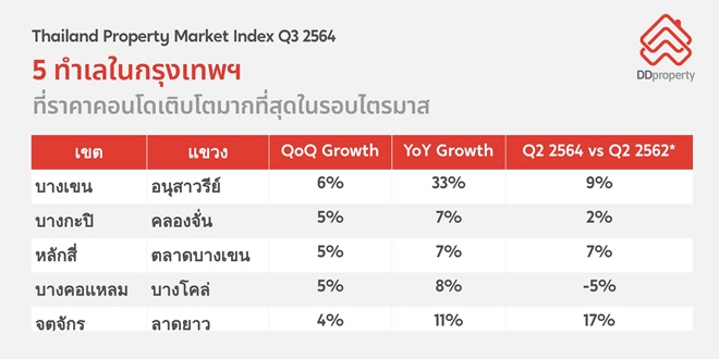 นอกจากนี้ทำเลที่ตั้งโครงการเป็นปัจจัยแรก ๆ ที่มีผลในการพิจารณาก่อนตัดสินใจซื้อ หากผู้ขายเลือกลงทุนในทำเลที่มีความต้องการสูงก็ย่อมเพิ่มโอกาสในการขายที่มากขึ้น โดย 5 ทำเลยอดนิยมน่าลงทุนในกรุงเทพฯ ที่ราคาคอนโดฯ เติบโตมากที่สุดในรอบไตรมาสที่ผ่านมา อันดับ 1 ได้แก่ แขวงอนุสาวรีย์ เขตบางเขน ราคาเพิ่มขึ้นสูงที่สุด 6% จากการเปิดให้บริการรถไฟฟ้า BTS สายสีเขียวส่วนต่อขยาย ตามมาด้วยแขวงคลองจั่น เขตบางกะปิ, แขวงตลาดบางเขน เขตหลักสี่, แขวงบางโคล่ เขตบางคอแหลม ราคาเพิ่มขึ้นในสัดส่วนเท่ากันที่ 5% และแขวงลาดยาว เขตจตุจักร มีราคาคอนโดฯ เพิ่มขึ้น 4%