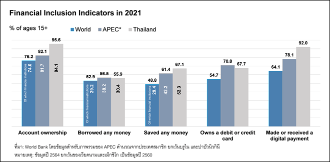 - อัตราการเข้าถึงบริการทางการเงินของไทยส่วนใหญ่อยู่สูงกว่าค่าเฉลี่ยของ APEC โดยจากข้อมูลของธนาคารโลก (World Bank) ในปี 2564 พบว่า ไทยมีสัดส่วนการมีจำนวนบัญชีทางการเงินกับผู้ให้บริการทางการเงินในระบบ (เทียบกับจำนวนประชากรที่อายุมากกว่า 15 ปีขึ้นไปทั้งหมด) การออมเงินที่สถาบันการเงิน การทำธุรกรรมชำระเงินทางดิจิทัล ในสัดส่วนร้อยละ 95.6 ร้อยละ 67.1 และร้อยละ 92.0 ตามลำดับ ซึ่งสูงกว่าภาพรวมของ APEC ที่อยู่ที่สัดส่วนร้อยละ 82.1 ร้อยละ 61.4 และร้อยละ 78.1 ตามลำดับ และสูงกว่าภาพรวมการเข้าถึงบริการในด้านดังกล่าวของโลกด้วยเช่นกัน