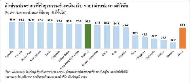 - ไทยมีความโดดเด่นในมิติของการทำธุรกรรมผ่านช่องทางดิจิทัล อันเป็นผลจากการผลักดันโครงการพร้อมเพย์ (PromptPay) และการฟรีค่าธรรมเนียมการโอนเงินช่องทางดิจิทัลตั้งแต่ปี 2560-2561 ต่อด้วยการผลักดัน Application เป๋าตังของภาครัฐในระยะเวลาต่อมา ซึ่งล้วนแล้วแต่ทำให้การทำธุรกรรมผ่านช่องทางดิจิทัลของไทยเติบโตเร่งขึ้นมาก โดยในปี 2564 มีสัดส่วนของประชากรที่ทำธุรกรรมชำระเงินประมาณร้อยละ 92.0 ซึ่งสูงกว่าภาพรวมของ APEC ที่ร้อยละ 78.1 ทั้งนี้ ทิศทางดังกล่าวสามารถต่อยอดไปสู่การเพิ่มการเข้าถึงสินเชื่อ รวมถึงสร้างความเชื่อมโยงด้านการชำระเงินกับประเทศสมาชิกอื่นๆ ได้ อันเป็นแนวทางที่ ธปท.กำลังดำเนินการอยู่ในปัจจุบัน